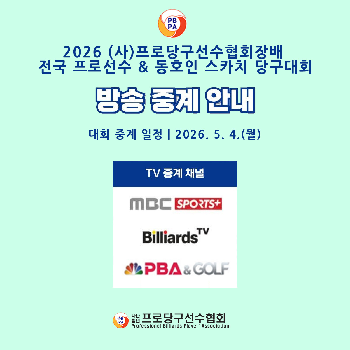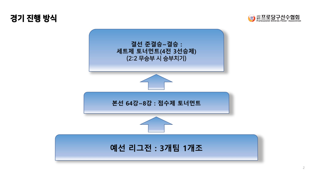 ▶ 사)프로당구선수협회장배 프로선수와 동호인이 함께하는 전국 당구대회 ◀ 안녕하세요. 프로당구선수협회입니다. 경기도체육육성지원사업으로 작년에 이어 프로당구선수협회장배 시합이 5월 2일~4일까지 진행됩니다. 선수 여러분들의 많은 관심과 참가 부탁드립니다. ● 대회일정 : 예선 2026.05.02(토) ~ 05.04(월) / 준결승 2026. 05. 04(화) 12:00 /14:30 ~ 결승전 18:00 ● 대회장소 : 고양 킨텍스 PBA 스타디움 - PBA 라운지 / 캐롬스페이스 ▶ 본선 경기장(준결승~결승) : 고양 킨텍스 PBA 스타디움 ● 참가자격 : PBA - LPBA 등록선수 중 본 선수협회 등록회원 + 동호인선수 ● 대회상금 : 총 상금 22,200,000 원 + (부상15,000,000 원) ● 대회요강발표 : 5월 15일 ● 출전접수 및 기간 : 180개팀(2인 1팀) 선착순 접수 / 5월 15일 부터 ~ 22일까지 ![]() ![]() ![]() |